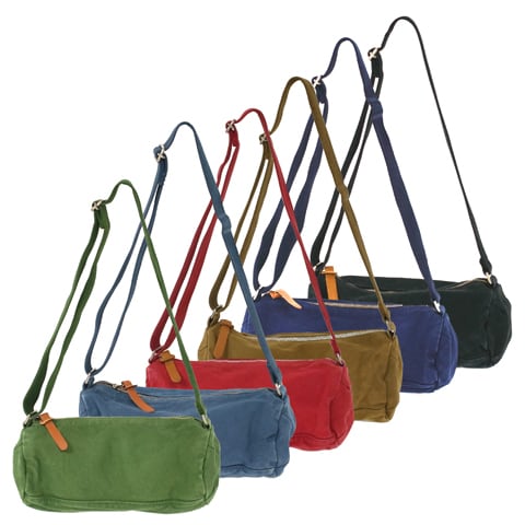 キャンバスのプリント下地でバッグの形に縫製後(製品完成後)、反応染料を用いて染めています。染後すぐにバイオウォッシュ(薬品を用いた洗い)を施し、全体にアタリ感を演出しています。